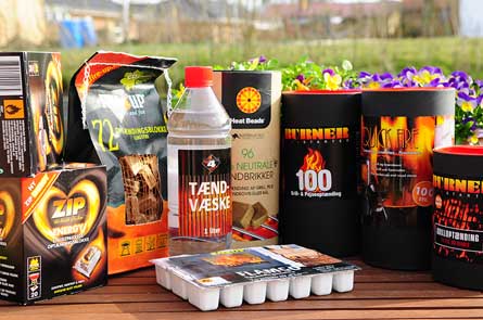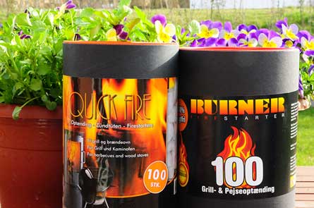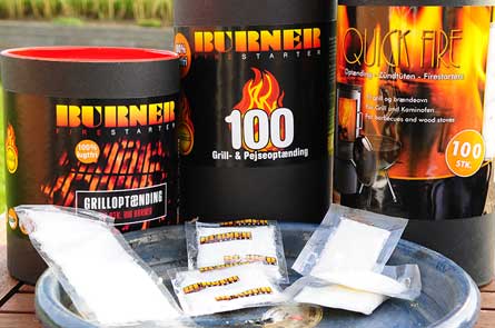 Burner kåres som bedste produkt i testen, da de brænder flot, har en god varme, brænder længe, er lugtfrit (så meget det nu kan...), er nemt at håndtere i de små poser. Produktet er ofte på tilbud i de store kæder. Burner er tydeligvis et meget bedre produkt end Quick-Fire, der skuffede fælt i testen. Produktet passer godt til alle typer kul/briket-grills. Under grillstarteren eller i bunden af grillstarteren giver en hurtig optænding. Med trækul lægges 2-3 poser ned mellem kullene og antændes. Efter 30 sekunder dækkes posen til med kulstykker og det brænder rigtig godt. |