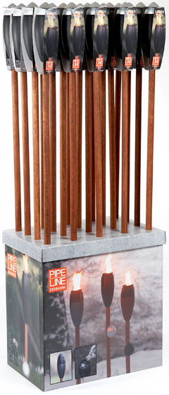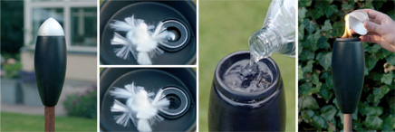 Facklan är utrustad med ett direkt refillsystem av lampolja och på sätt undgår man beröring av facklan under påfyllning.